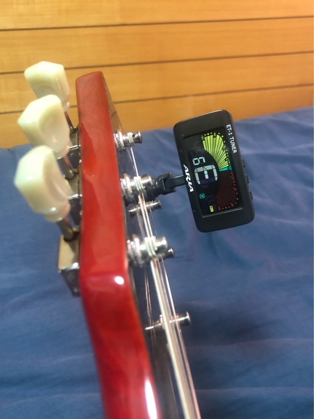 もし中央からズレている場合は、チューナーを見ながらペグを少しずつ回して弦の張りを調整します。もちろん毎日使う物なので私はヘッドに付けっぱです🎵