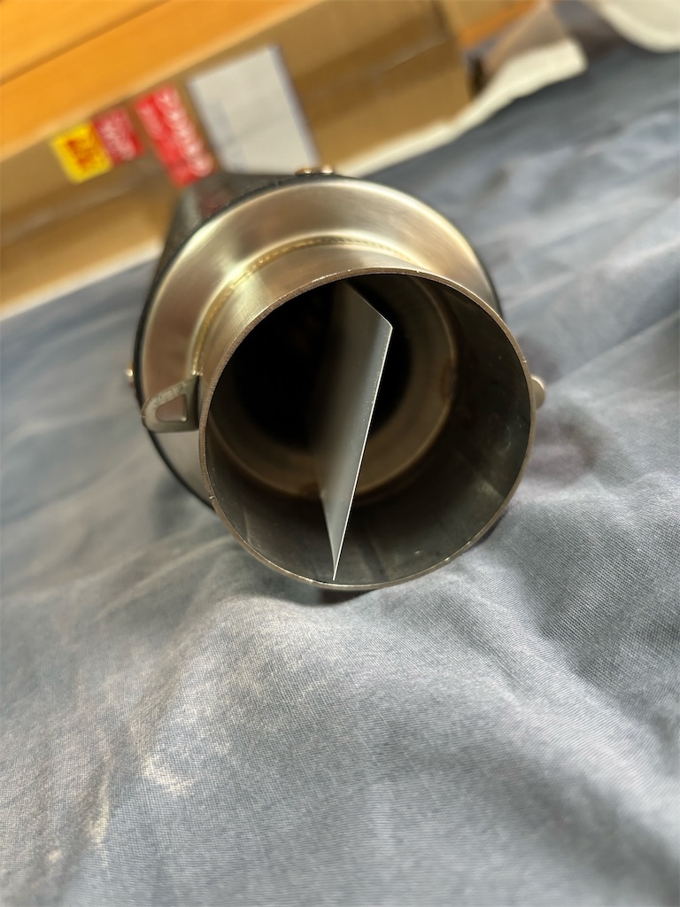 前回のステンレス製サイレンサーは、全長60cm外径Φ90内径Φ60というスペックの爆音タイプ(笑)。 音は直管よりは静かかな?って感じでした。 流石に爆音すぎたので音量調整バルブを自作したりもしましたが、車検でワイバーンに戻したついでに手放しました。
